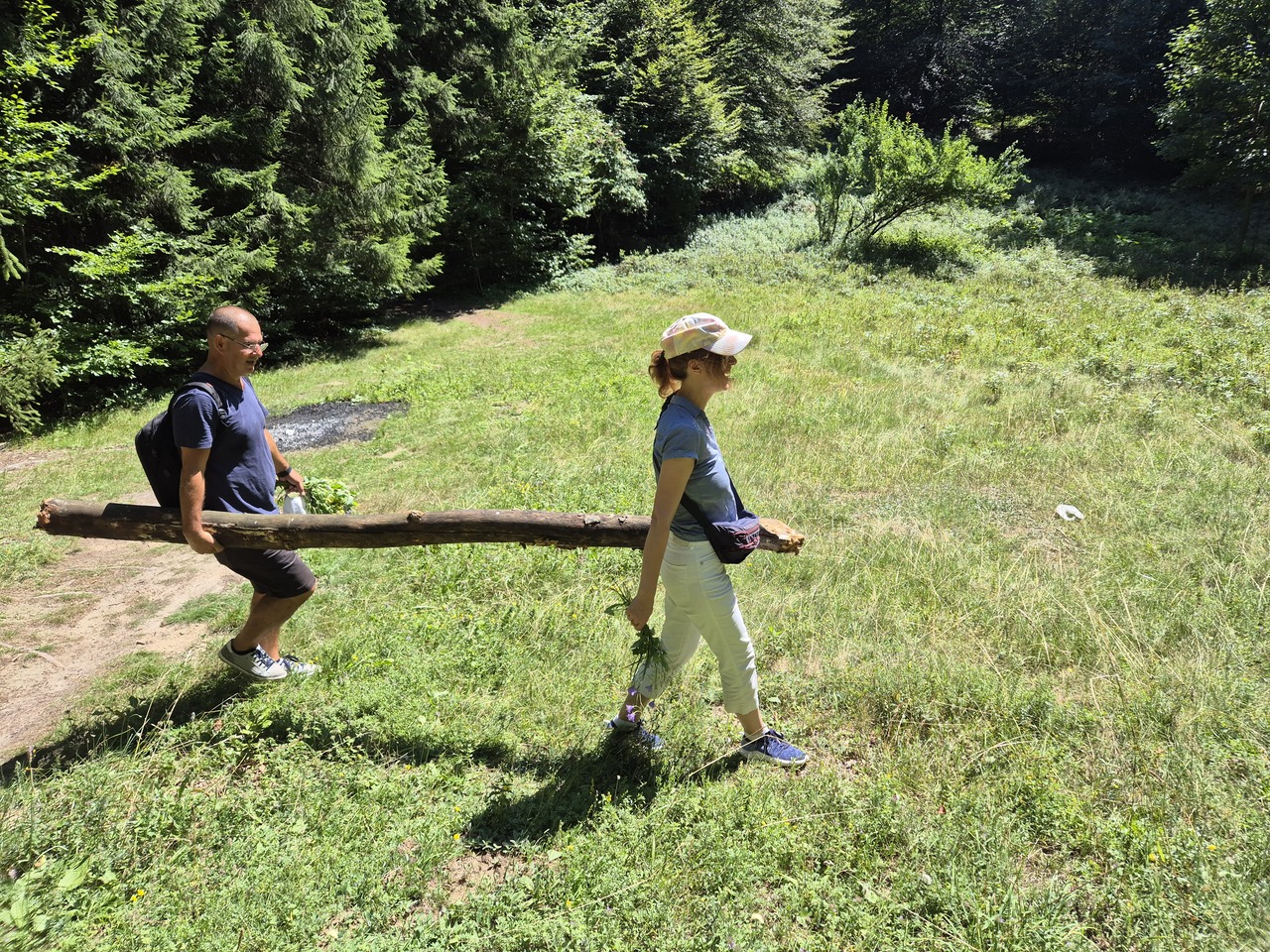 Au gasit un bustean in padure si il aduc pentru a servi drept bancuta.
