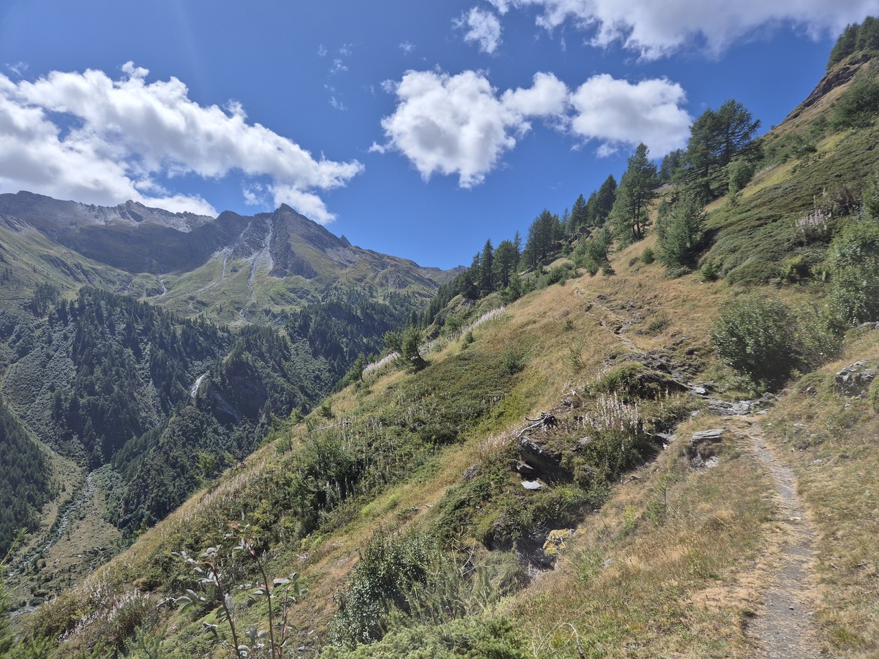 Poteca urca destul de sus pe versantul vaii Germanasca. Varful din fundal nu este al meu ci probabil Gran Guglia, cu 200m mai jos.