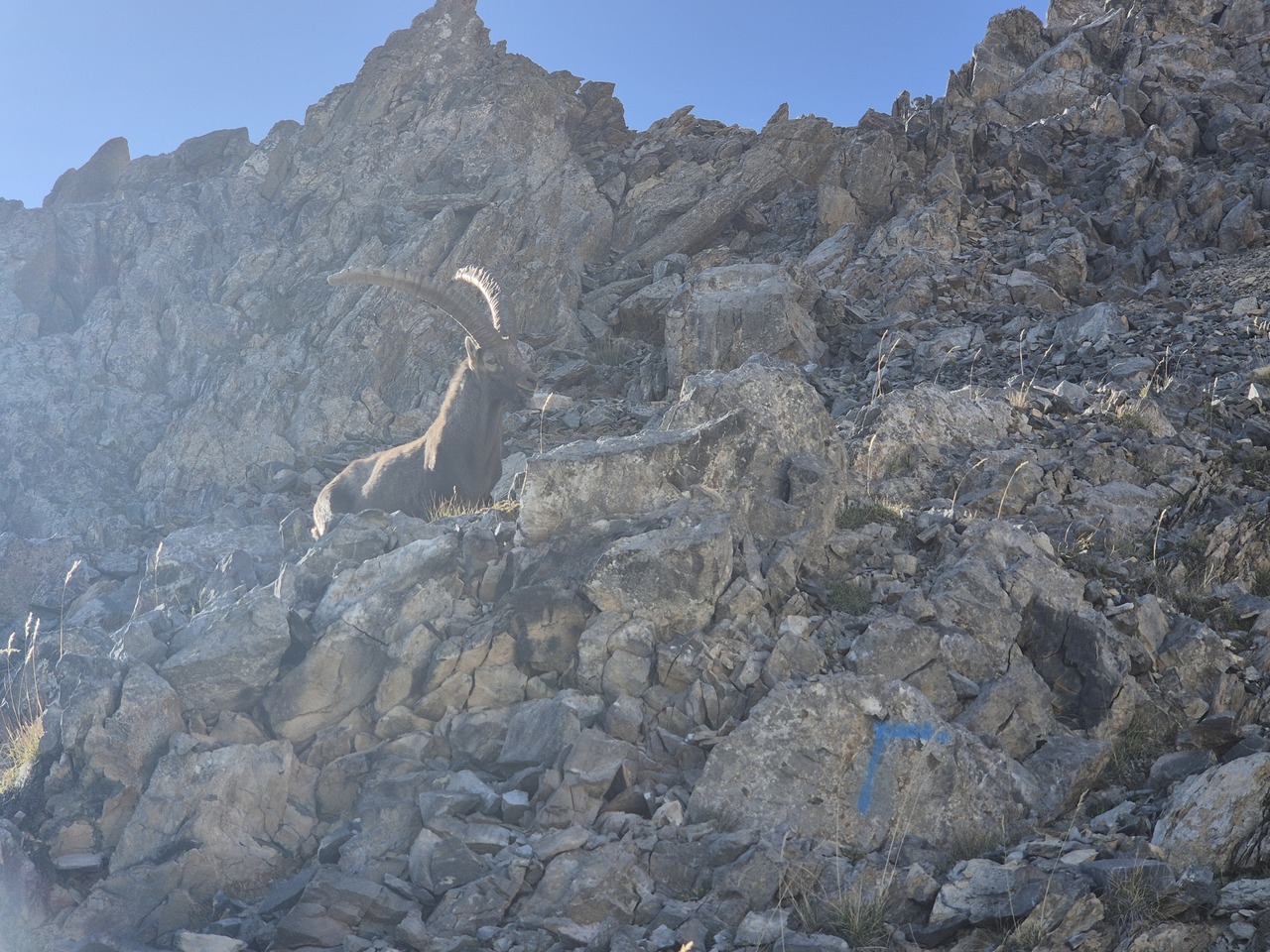 Spre sfarsitul urcusului pe/langa grohotis. Se vede si un marcaj al traseului.