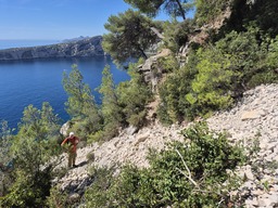 pe o poteca foarte putin clara spre partea estica a plajei, apoi pe langa