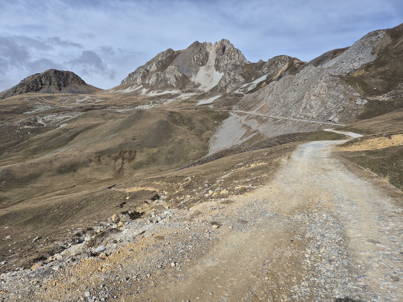 Am de mers cativa kilometri de la parcarea din Colle Valcavera spre baza muntelui. In centru este Becco Grande; pe grohotisul de culoare deschisa am urcat