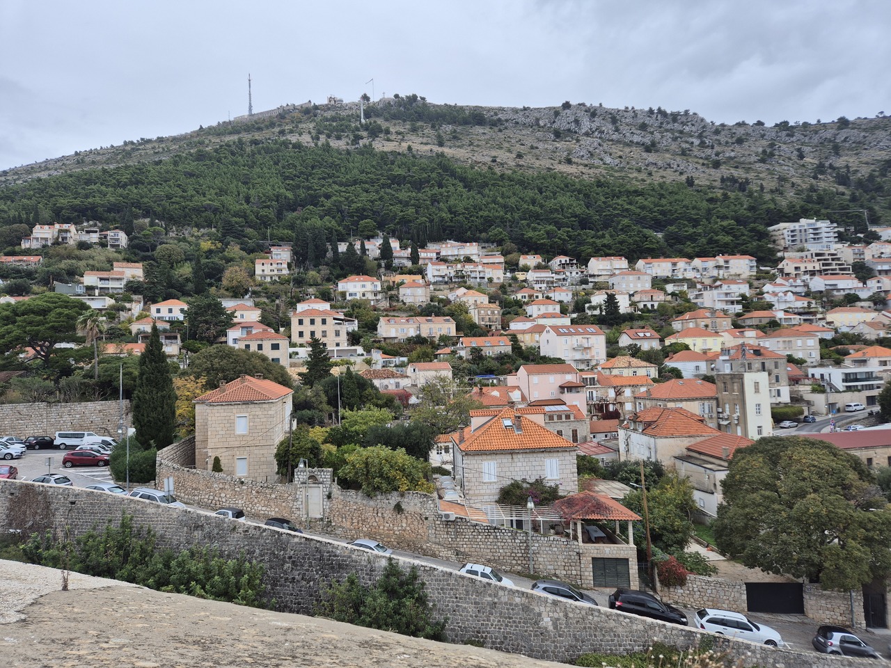 Vedere din oras; se vede dealul Srd. Fortul este acolo unde este acel stalp de telecomunicatii inalt.