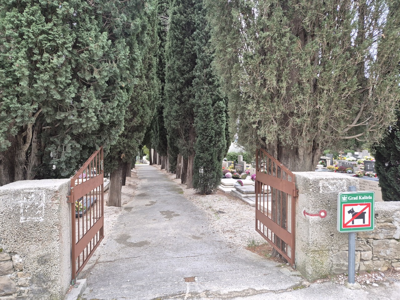 Marcajul este cercul rosu cu alb in mijloc din dreapta. Poteca chiar trece prin cimitir!