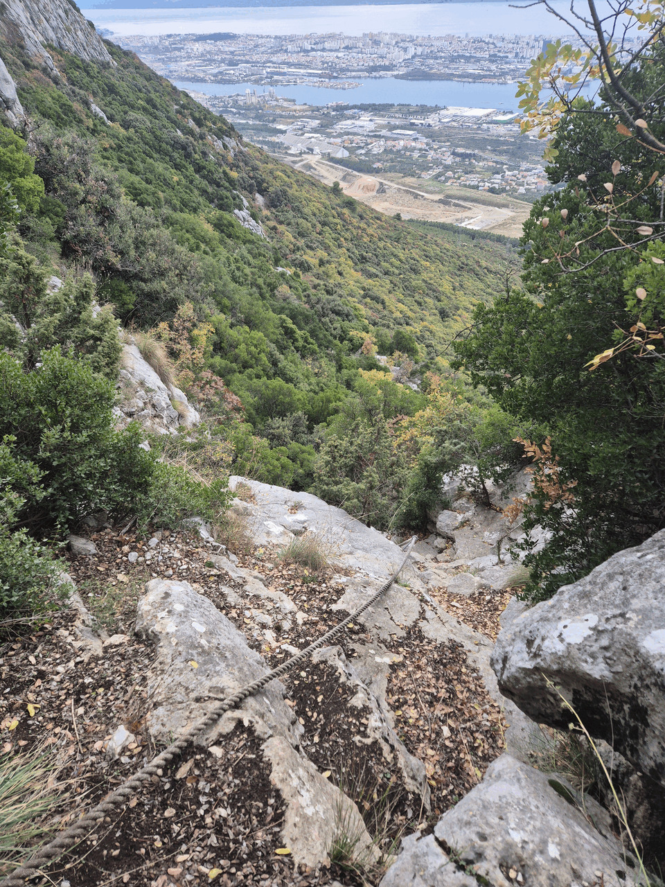 La trecerea de pe coborarea peste stanci la cea prin padure; aceasta portiune de stanci mai verticale se depaseseste cu ajutorul a doua corzi.