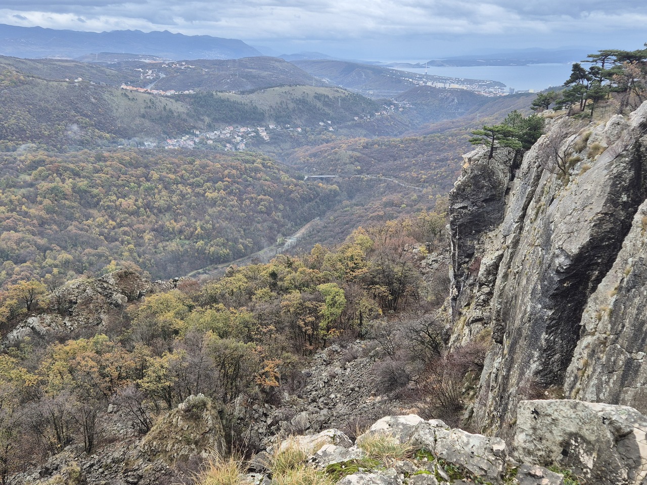 In Grohovo am parasit albia raului si am inceput sa urc sustinut. Aici sunt pe varf, la circa 430m altitudine. Se vede in centrul fotografiei podul peste care am trecut si apoi, spre stanga, valea raului Rjecina. Departe, in stanga-sus - marea.