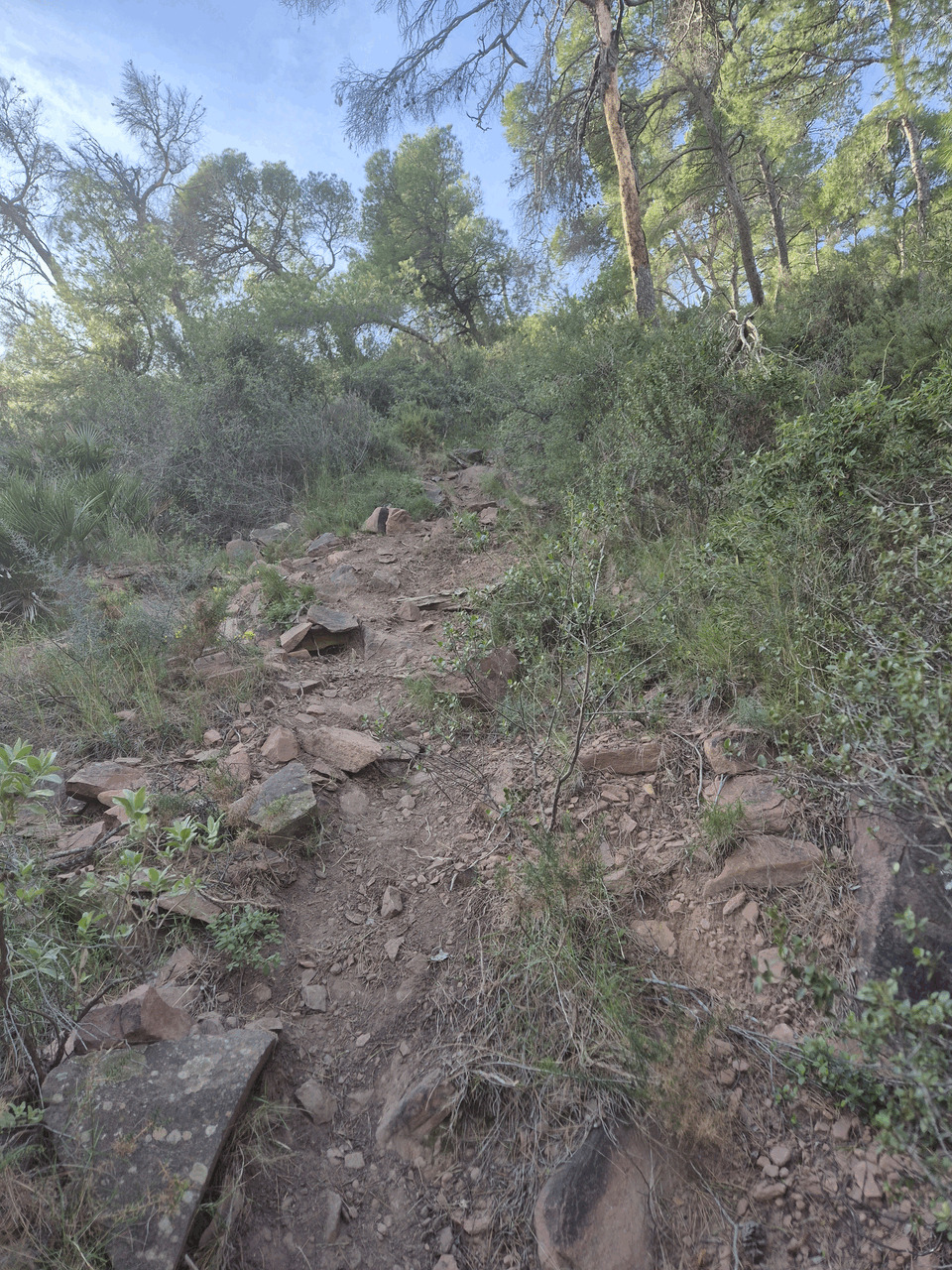 La circa 100m altitudine incepe urcusul serios spre varf (373m altitudine); este o poteca putin batuta si foarte inclinata. Prima jumatate este pe pamant, printre copaci ocazionali...