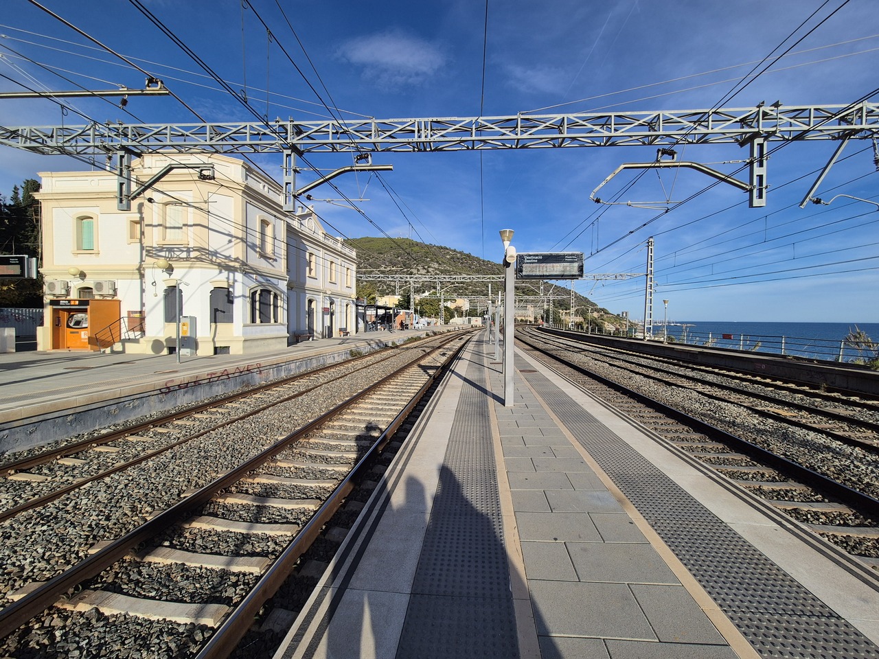 Asteptand trenul inapoi spre Barcelona (a venit perfect in grafic). In dreapta este marea, in stanga - muntele pe unde am urcat.