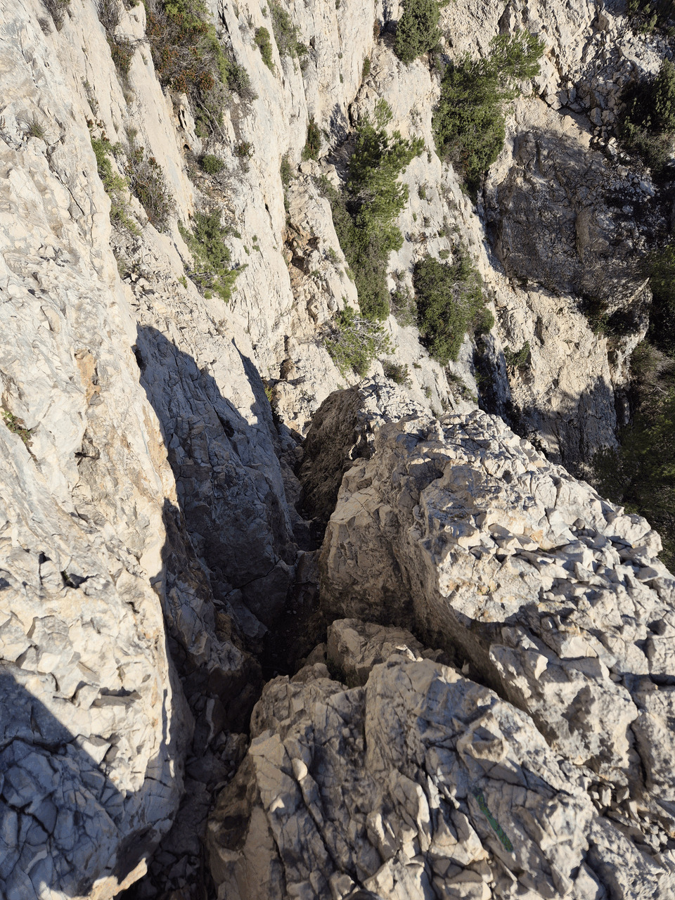 La inceput trebuie coborat (fara lant) in fisura foarte inclinata din stanga.