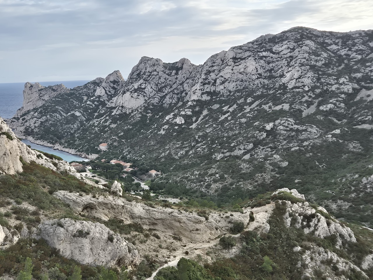 De pe poteca rosie spre Les Baumettes. Se vede creasta Serron de Sormiou; am parcurs-o dinspre dreapta spre stanga, pana la cea mai clar conturata sa.