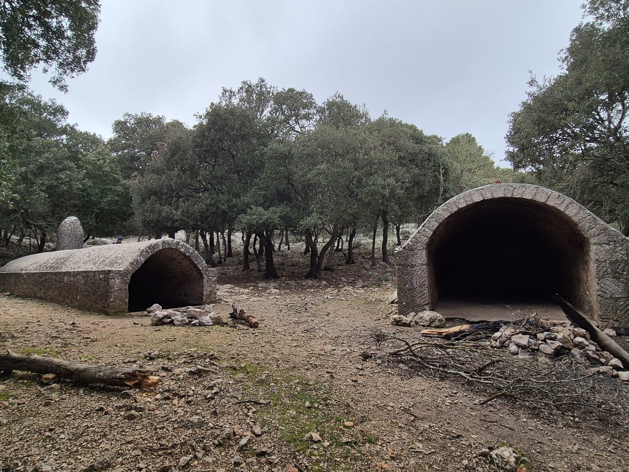 In stanga este un izvor si un pic de apa stransa in subteran; in dreapta un fel de adapost-cabanuta.