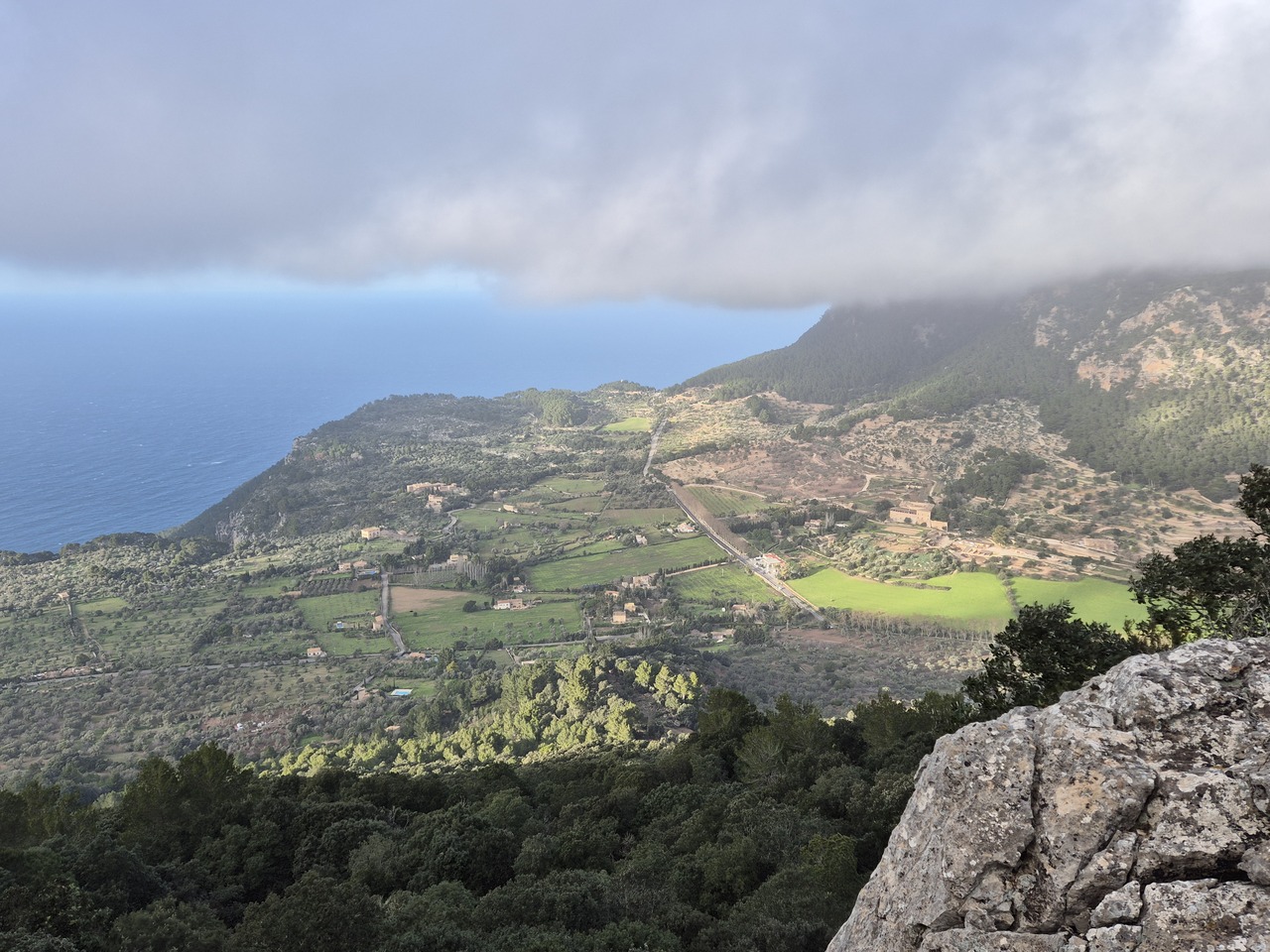 Vazuta cam de la maximul zilei. Valldemossa este jos, mai in dreapta (nu se vede de aici) iar muntele cu varful Es Cargoli este in fata, in ceata.