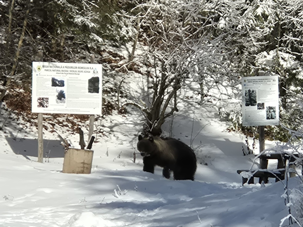 Hopa! De pe podul peste Azuga vad eu ursul la vreo 100m, in locul de picnic si le zic calm celorlalti: Uite ursul!