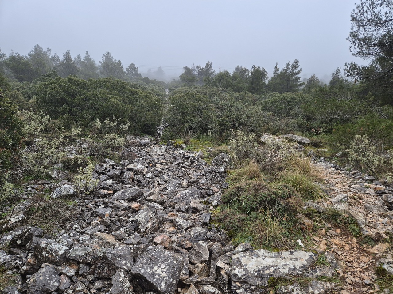 Se inainteaza pe pietroaie. Continuarea este fix in fata, printre tufisuri. A inceput deja sa ploua.