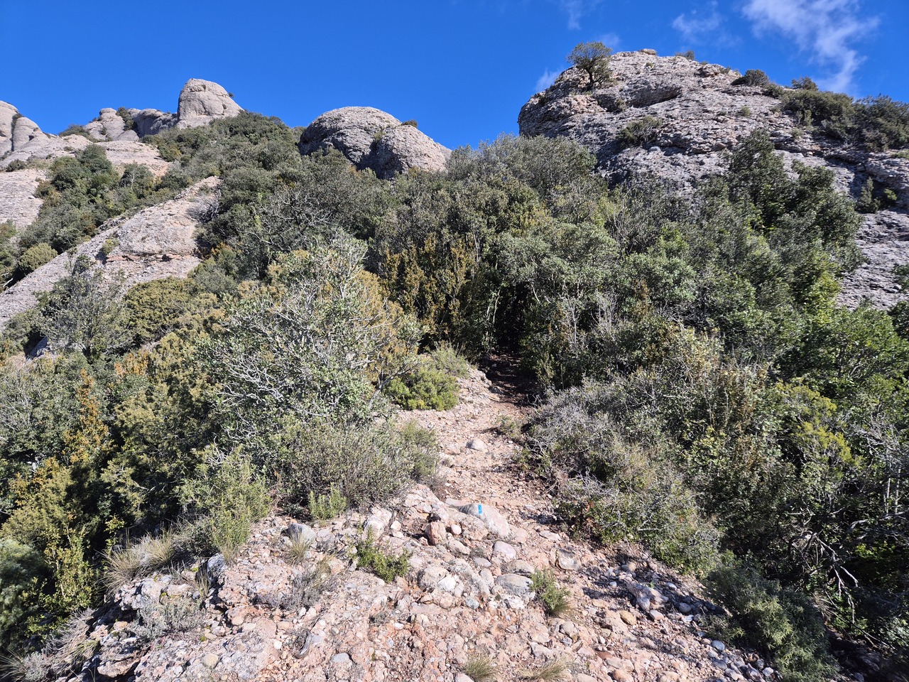 Am iesit apoi in poteca normala ce urca spre Capella de Sant Joan via Pas de la Mallenquera; poteca decenta, proaspat marcata cu dunga albastra, o placere sa o urci. Aici iesisem la gol undeva pe la 920m altitudine.