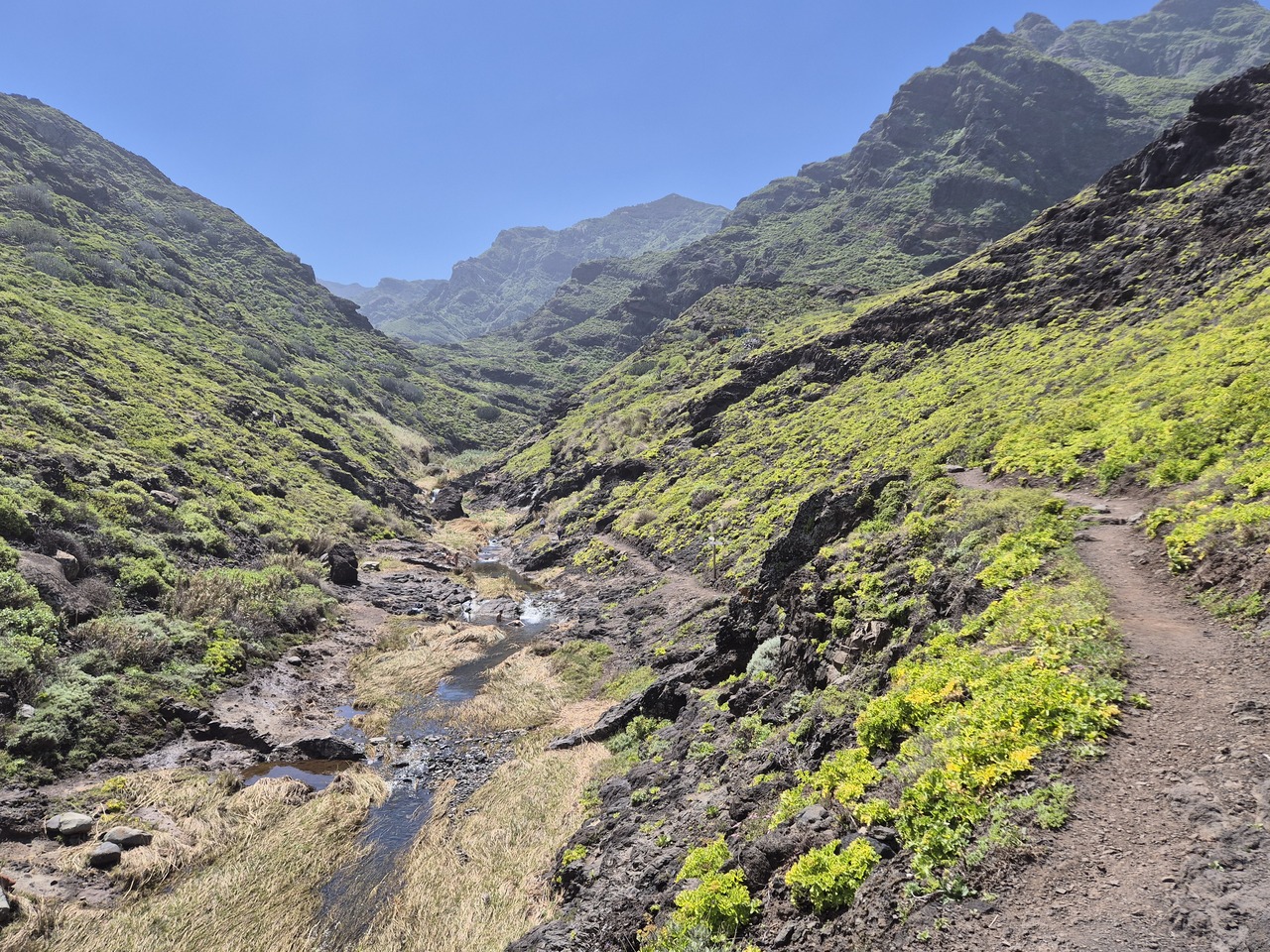 Voi urca pe aceeasi bucata de PR-TF 8 folosita si la coborare. Diversi oameni fac baie in rau.