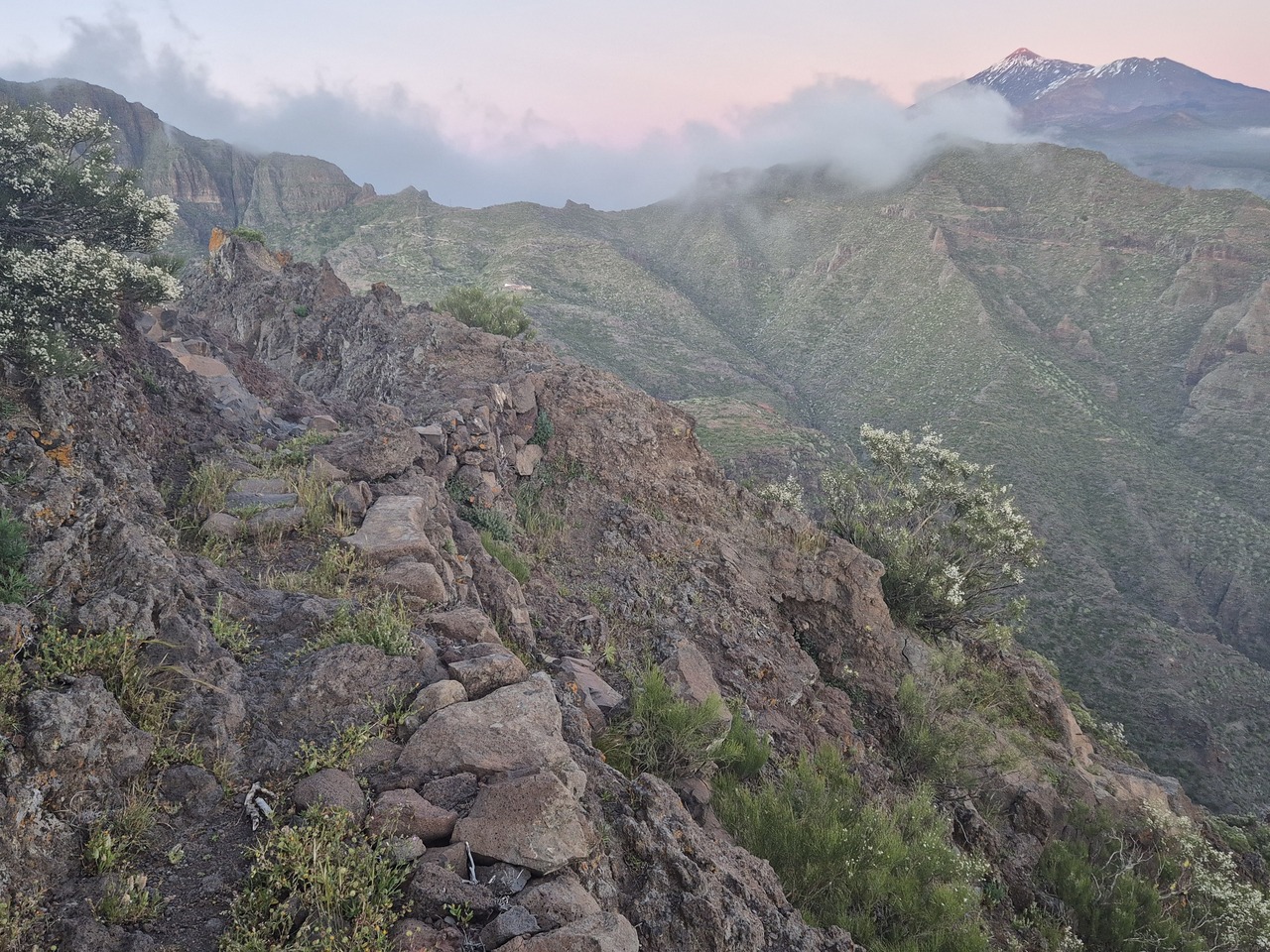 Putin inainte de scara; in dreapta ultimele raze de soare ilumineaza vulcanul Teide.